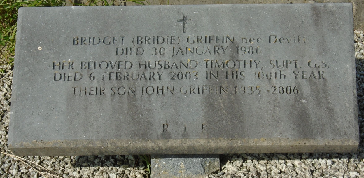 Son of John Griffin and Bridget Somers. Married Bridget 'Bridie' Devitt on 28th July 1934 in Ennis Cathedral, County Clare. Promoted to Sergeant on 1st October 1923 and was Weights and Measure Sergeant in Clare District. Reached the rank of Inspector on 23rd October 1941 before he was finally promoted to Superintendent on 9th February 1955. Retired on 18th April 1966 while stationed in Adare County Limerick. Was an active member afterwards wth Adare Manor Golf Club. He is buried in Ennistymon Cemetery. |