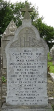 Son of Eugene Kennedy (a farmer) and Mary Daly. Married Nellie Keane on 4th August 1934 in Knocknagoshel, Brosna, County Kerry. Retired and settled in Killeage Road, Castlemartyr. Died on 12th February 1966 in Castlemartyr. He is buried in St. Colman's Cemetary, Farahy, Kildorrery, Co. Cork. |